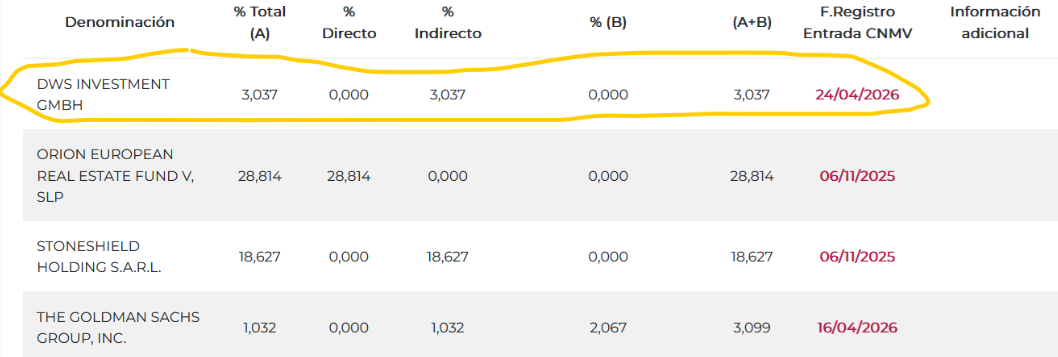 noticia urgente en neinor : DWS entra en neinor con una participación del 3,037 % aunque de forma in..........