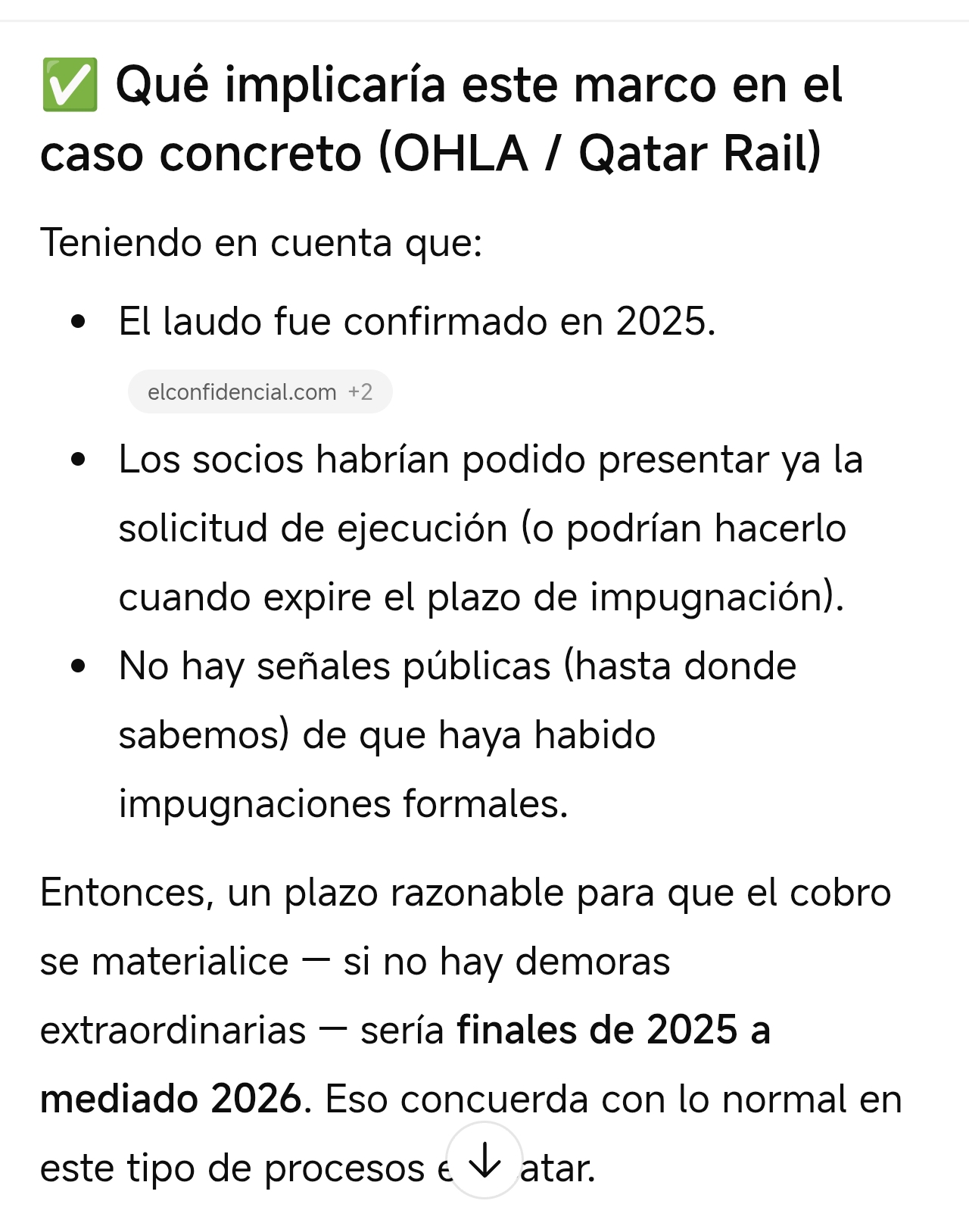 Yo daba por hecho que el extraordinario era el metro de Doha, esta resolución de sidra me ha sorprendido positivamente y mejora aún más el escenario ya Doha también se cobrará pronto y son 45 M€ netos para la caja y el balance....