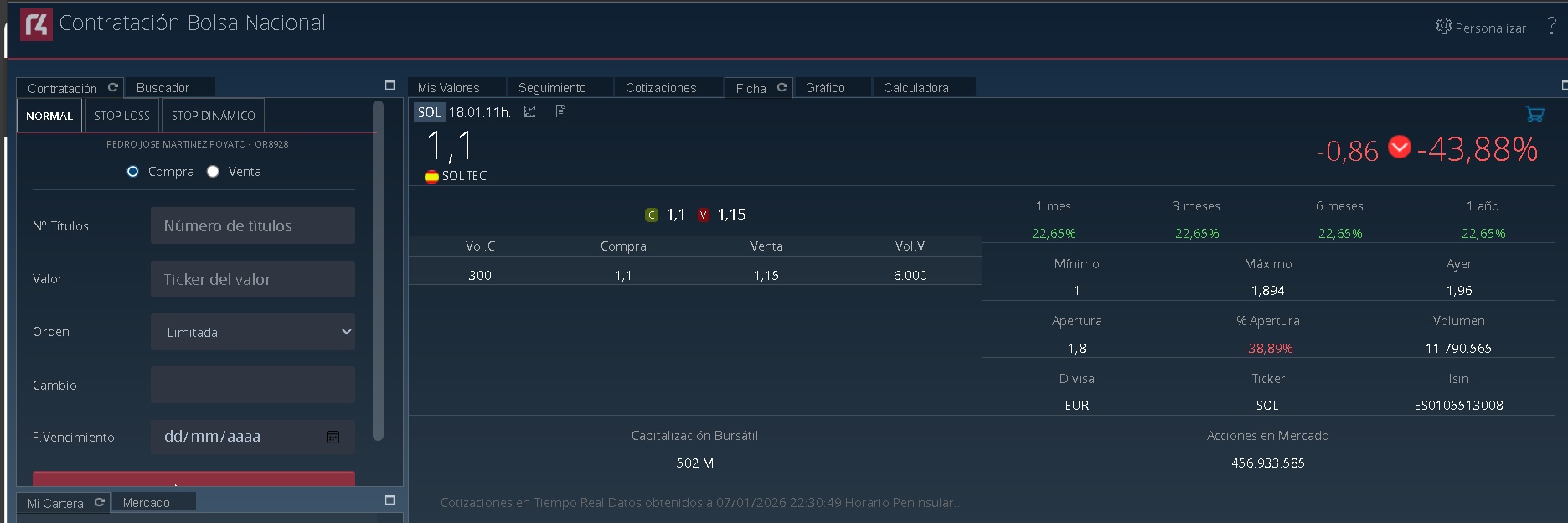 El precio vuelve en 0,0821€ antes de apertura de sesión. El nominal es 0,05€, y se supone que es el precio mínimo límite. Para comprar, como puede haber alta volatilidad, está la orden de compra limitada en vez de "a precio de mercado".
